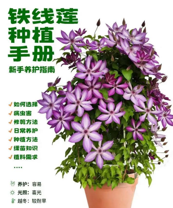 - 铁线莲耐寒性较强,但不耐霜冻,冬季需覆盖保护。