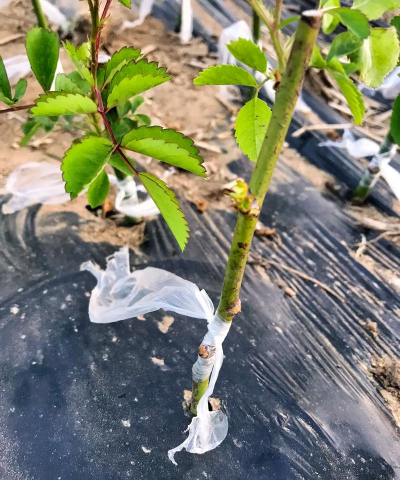 30一35天砧木插条便 形成完整的根系,部分嫁接的玫瑰芽也 开始萌发,此时便可移栽。首先挑出接 芽死亡的砧木插条,保留砧木原有复叶,抹去砧木上萌发的普薇芽,以集中 养分、水分供给嫁接芽。其次是在水肥充足、事先整好畦墙的地块内开沟栽 植,可使砧木根系舒展。株距20厘米, 行距40厘米,深10厘米,栽后扭土踩 实,浇透水。
