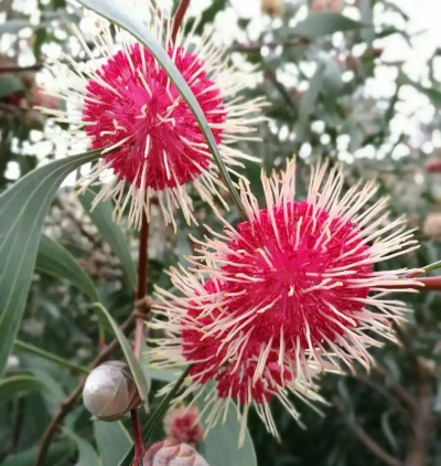 桉树开花时,花量较多,花朵密集,形成花簇,在植株上显得尤为醒目。