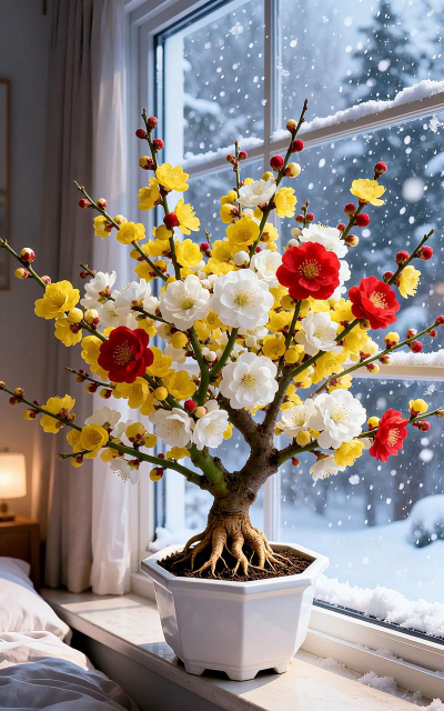 色彩搭配:腊梅花的花色偏白,搭配红色、黄色、橙色等鲜艳色彩的花,可以形成鲜明对比,增加视觉效果。例如,搭配红色的蔷薇、橙色的郁金香或黄色的菊花。