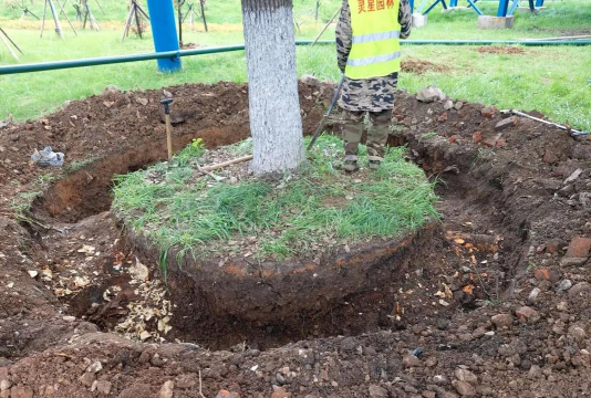 移栽的大树要求树型良好、姿态优美、生长健壮、无病虫害,同时还要求树木的生态学特性与栽植地环境具有一致性。一般在梢次缓慢生长或停止生长后,提前3~6个月断根,规格越大的树,断根提前时间越长。断根后用生根粉浸泡,然后填土浇水,使树木移植时有一定数量的新根[2].