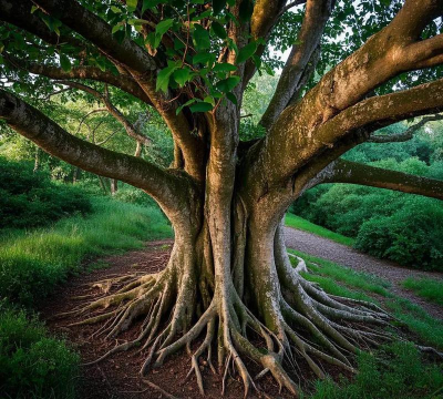榕树在自然状态下,通过气生根和不定根的生长方式,逐渐形成发达的根系。这些根在生长过程中会不断向周围扩展,形成庞大的根系网络。