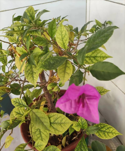 三角梅生长期间需要充足的养分,若肥料不足,会导致叶片发黄。