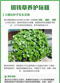 铜钱草是一种常见的观赏植物,其叶子呈圆形,生长旺盛时叶子较大。为了让铜钱草的叶子更大,可以采取以下方法: