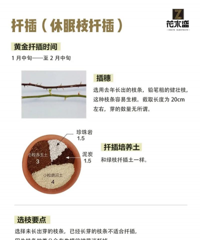 - 扦插:将枝条插入湿润的土壤或培养基中,保持湿度。