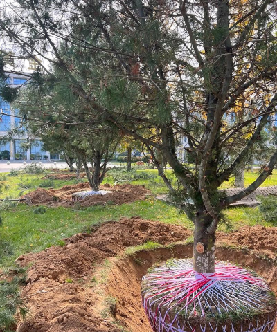 此项工作要在移栽前2~3天进行,本着浇足浇透的原则实施灌水,在灌水过程中可施入适量的生根剂,使根系能充分吸水、利于生根。水浇透后,也有利于根系的打包成球,防止因土壤过干而散土球,降低树木的成活率。