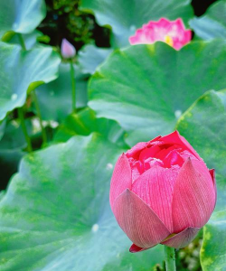 荷花在开放时姿态优雅,花心朝上,花瓣舒展,仿佛在水中亭亭玉立,给人一种宁静、高雅的感觉。
