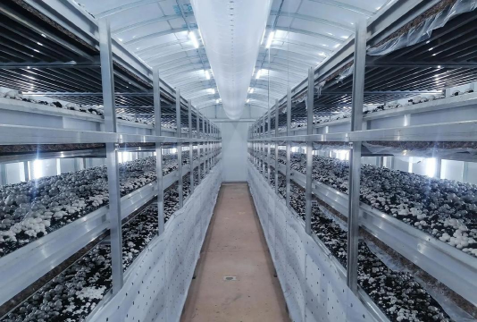 蘑菇的速冻宜采用流化床速冻装置。将冷却、沥干的蘑菇均匀地放入流化床传送带上,由于蘑菇在流化床中仅能形成半流化状态,因此传送带的蘑菇层厚度为80-120cm,流化床装置内空气温度要求-30至-35℃,冷气流速4-6m/s,速冻时间12-18min,蘑菇中心温度为-18℃以下。