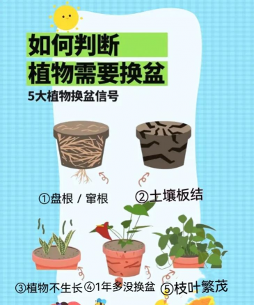 - 如果植物生长缓慢、叶片发黄、枯萎,可能是由于土壤贫瘠或排水不良,需要换盆。