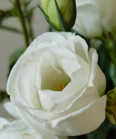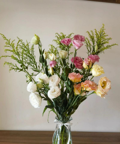 插花:将洋桔梗的茎部插入花瓶中,确保花茎直立,不要压住花苞。