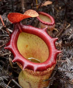 捕虫壶:猪笼草最显著的特征是其“猪笼”状的捕虫壶,通常位于叶片的末端,形状类似一个倒置的水壶,内部有黏液,可以吸引昆虫落入其中。