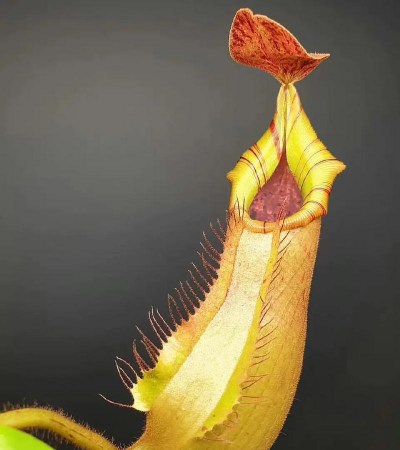 猪笼草的叶片形状独特,像一个大而深的容器,内部有液体,能够吸引昆虫落入其中。昆虫一旦进入,由于叶片的结构和液体的特性,会无法逃脱,最终被消化。