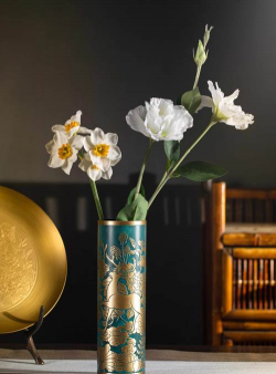 铜花瓶本身具有独特的质感和光泽,能够为花瓶增添一份艺术感,尤其适合摆放在客厅、阳台或书房等空间中,提升整体的视觉美感。