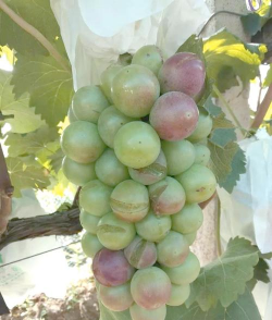 3、在搞好疏果的前提下,于开花后2~3周全树喷一遍800倍大生M-45(重点是果穗),随即套袋(以青岛佳田葡萄袋效果最好)。采果前2周左右摘袋,避免过早摘袋遇雨造成裂果。
