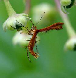 成虫为褐色小型蛾子,形态似蚊,前翅缘分裂达翅中部;后翅分3裂,达到基部,每片均密生羽毛状缘毛。足细长,并有突出的“距”。