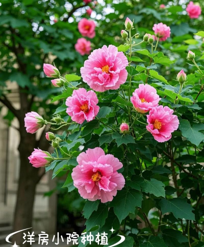 山茶花花型独特,颜色鲜艳,与芙蓉花搭配后,能形成一种高贵典雅的搭配,适合用于庭院或花坛。