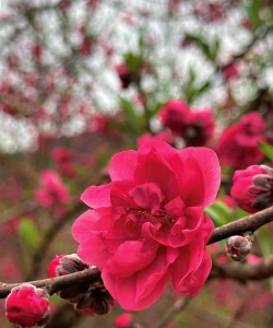 霜红桃开花时,花朵会呈现出浓郁的红色,有时带有白色或粉红色的斑点,整体呈现出一种热烈、优雅的视觉效果。在适宜的气候条件下,霜红桃的花期通常持续数周,是观赏花卉的佳选。