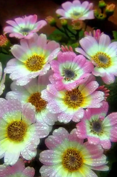 瓜叶菊的花通常为聚伞花序,由多个小花组成,呈伞状或球状的结构。每个小花的形状较为紧凑,呈圆锥形或球形,花冠颜色多样,常见为深紫色或红色,边缘带有白色或粉红色的斑纹。