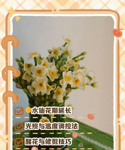 水仙花的花期受多种因素影响,包括品种、种植环境、施肥、浇水和光照等。要延长水仙花的花期,可以采取以下方法: