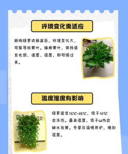 绿萝适宜生长温度在15-28℃之间,如果温度过低,会导致叶片发黄、叶尖枯死。