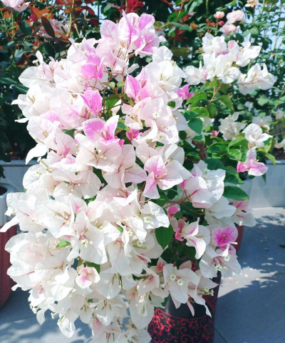 像小伞盖:三角梅的花朵在枝条上呈伞状排列,整体呈现出一种蓬松、柔软的视觉效果,类似小伞盖。