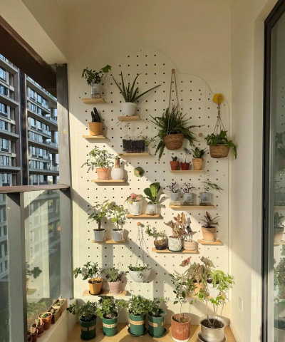 适合有悬挂空间的区域,如阳台、客厅,可放置多盆盆栽,如多肉、绣球、茉莉等。花艺墙
