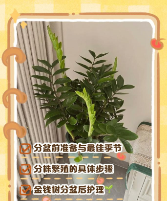 金钱树生长过程中如果过于拥挤,会影响其通风和光照,导致植株生长不良、叶片发黄甚至枯死。若要分盆,可以按照以下步骤进行: