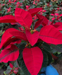一品红的花朵通常呈球形或圆锥形,花心为黄色,周围环绕着红色或粉色的花瓣,整体造型美观,具有较高的观赏价值。