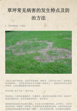 3.夏季斑病流行预测的主要理论依据和预测方法①气象因子:病菌在春末土壤温度达到18℃至20℃时开始侵染(当5厘米土温度达到18.3℃时),北京地区在6月中旬左右,此时为第一次用药时间。病害发生的最适温度为28℃。当温度达到30℃至35℃时,症状最严重。七八月份的高温、高湿、降雨(包括频繁浅层灌水)是夏季斑病流行的重要气象因素。②草种间以草地早熟禾最感病,而草地早熟禾不同品种间抗感反应也很明显。③夏季草坪修剪越多、留茬越低,病害相对就重;反之就轻。④其他养护措施:碱性、干旱、紧实板结、经常践踏的土壤发病重;排水不良、频繁的浅灌溉或过多灌水病害;不当的施用除草剂、速效氮肥等也会加重病害。