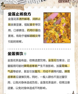 4.金莲薄荷茶:金莲花2朵,薄荷3克,薰衣草半匙(一杯为量),沸水冲泡,代茶饮用,可以滋润舒缓喉咙,防止喉咙沙哑干涩。
