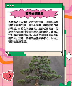 - 解决方法:将五针松移至光照充足的位置,每天至少接受4-6小时阳光照射。