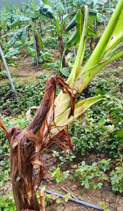 香蕉叶冻死可能是因为冬季低温或霜冻影响了植株,导致叶片受损甚至死亡。以下是一些处理建议: