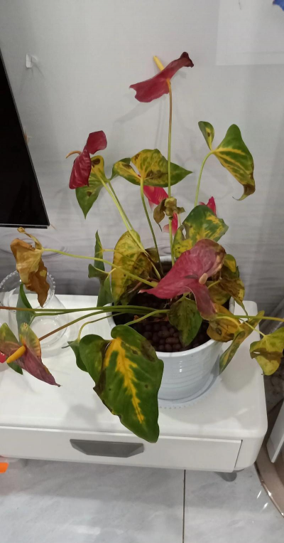 红掌需要充足的光照,否则叶片会变黄、脱落。