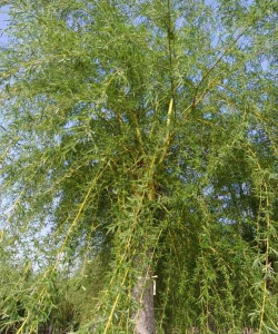 金丝垂柳因枝条呈金黄色而得名,为杨柳科柳属落叶乔木,其生长速度快,枝条自然下垂,树形优美,冬季满树金黄色的枝条如同一条条黄色丝绦,明媚耀眼,春季黄色枝条与绿色新芽交相辉映,美丽异常,夏秋季节则浓荫蔽日,满眼青翠,令人陶醉。