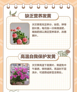 天竺葵(也称“太阳花”)是一种非常受欢迎的观赏植物,通常生长在光照充足、通风良好的环境中。如果天竺葵叶子发黄,可能与光照、浇水、土壤、施肥或温度等因素有关。以下是几种常见原因及解决方法: