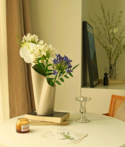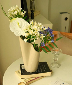 除花瓶外,人们日常生活所用的陶罐、瓷碗、玻璃器皿、竹筒、酒坛以及杯碟、羹匙之类均可作插花之用。一般来说,陶瓷及玻璃器皿能较好地保持清洁,水也不易变质,因而使用较多。容器应注意与花相互配合,若插小型菊花、石竹等体态轻盈、色彩鲜亮的花卉,可选用晶莹的玻璃瓶;插月季、百合、白玉兰、郁金香等典雅的花卉,则应选择端庄、大方的花瓶;器皿上有图案时应特别注意,若容器上的图案与插花材料不协调,会影响插花的美感,但容器图案太好,又会转移人们视线,喧宾夺主,因此最好选择没有图案的器皿;此外,容器还应与居室空间环境相协调,矮小的房屋不宜采用过高的容器,宽敞高大的厅室,也不宜选用小型容器,中式房间应选中式古器瓶;走廊中采用竹器、陶器或瓷器,则显得活泼生动。