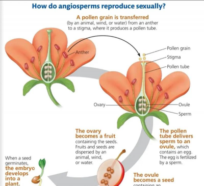 雄蕊的花药产生花粉粒,花粉粒含有花粉管和花粉。花粉粒的传播
