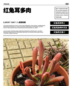 达摩兔是多肉植物中的一种常见品种,属于多肉植物(Cactus)的范畴,但并非传统意义上的仙人掌科植物。达摩兔以其独特的肉质叶片和鲜艳的色彩而受到许多养花爱好者喜爱,尤其适合放在阳台、窗台等光照充足的地方。肉质叶片:叶片厚实,具有很强的储水能