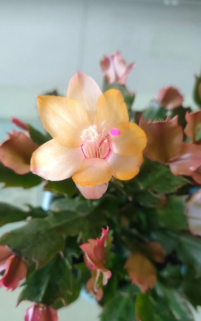 有些品种在黄色的基础上带有橙色或橙黄相间的斑纹,颜色更加丰富。渐变蟹爪兰