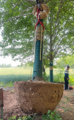挖取苗木时应带土球起苗时,根部要注意带上土球,土球的直径可以为地径的6~12倍,避免根部暴露在空气中,失去水分。裸根苗要随起随假植;珍贵树种或大树还可用草绳缠裹,以防土球散落,同时栽后根土密接,根系恢复吸收功能快,从而提高成活率;需长途运输的苗木,苗根要蘸泥浆用塑料布或湿草袋套好后再运输。
