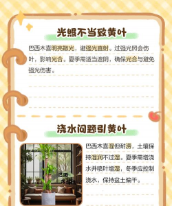 巴西木黄叶的主要原因通常与浇水、光照、土壤、施肥和病虫害有关。解决方法应从改善环境条件入手,保持土壤湿润但不积水,提供适宜光照,合理施肥,并定期检查病虫害。如需进一步帮助,可提供具体生长环境,以便更精准地诊断问题。