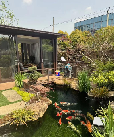 可在阳台或庭院内设置小型鱼池,种植耐水的花卉,如水生植物(如荷花、睡莲)和陆生花卉(如郁金香、玫瑰)。大型鱼池养花