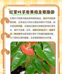 红掌发黄通常是由于多种因素造成的,如光照、水分、土壤、肥料或病虫害等。以下是常见原因及解决方法:
