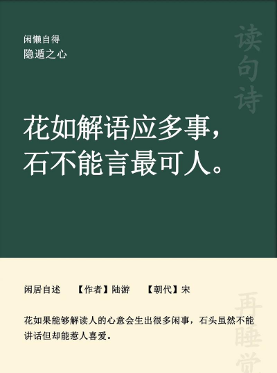养花玩石,是中国传统文化中的一种艺术表达,常融入诗词之中,展现自然与人文的和谐之美。以下是一些与养花、玩石相关的诗句,供您欣赏: