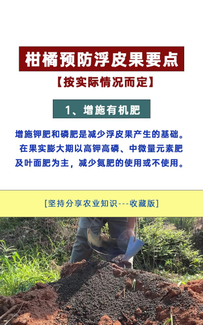增施钾肥和磷肥是减少浮皮果产生的基础。对于浮皮果,平时多增施有机肥,同时在果实膨大期以高钾高磷、中微量元素肥及叶面肥为主,减少氮肥的使用或不使用,秋梢氮肥过量后期施用氮肥,促使果实二次膨大,容易造成浮皮。