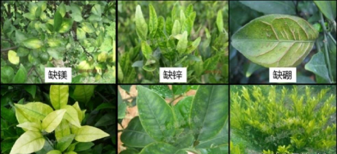 缺镁时,植株矮小,生长缓慢。发病时其叶片黄化呈肋骨状,叶片基部常保持较久的绿色呈倒“三角型”。柑橘缺镁时,冬季落叶严重。