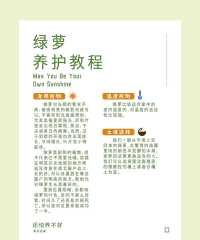 绿萝是一种常见的室内观赏植物,具有较强的适应性和生长能力,但为了使其生长得更好,需要提供适宜的环境和养护方法。以下是绿萝的养护要点: