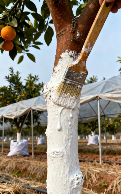 霜冻前树干缠草,树盘培土,主干刷白,预防冻害及树脂病等病害发生。树干刷白的配置方法:用生石灰15-20公斤,食盐0.25公斤,石硫合剂渣液1公斤加水50公斤,进行配置。