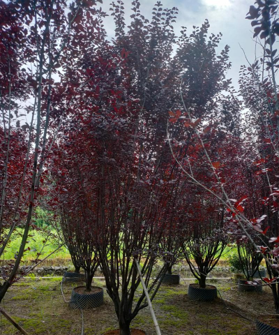 1、矮分枝红叶李。丛生红叶李的用量还是比较大的,这种苗子在种植的时候可以培养矮分枝红叶李,将一些树形比较差或者是中等粗度的红叶李在离地面30cm以上的位置全部锯断,一般在秋季或者冬季锯杆培育。锯杆后保留较短的主干,使其分生侧枝,这样就会使红叶李枝条密集,再进行培育,慢慢的就会形成地笼丛生树形。这种方法很简单,如果是刚刚尝试培育丛生红叶李的新手,可以试一下这个方法。
