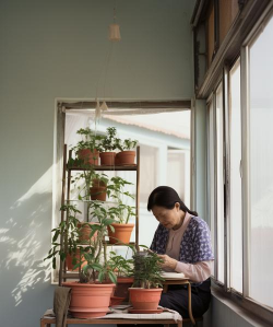 在她的照料下,花草不仅长得茁壮,还散发着淡淡的香气,为家里增添了一份宁静与愉悦。无论是忙碌的白天还是宁静的夜晚,她总是用心呵护着这些植物,让它们在她的关爱中茁壮成长。